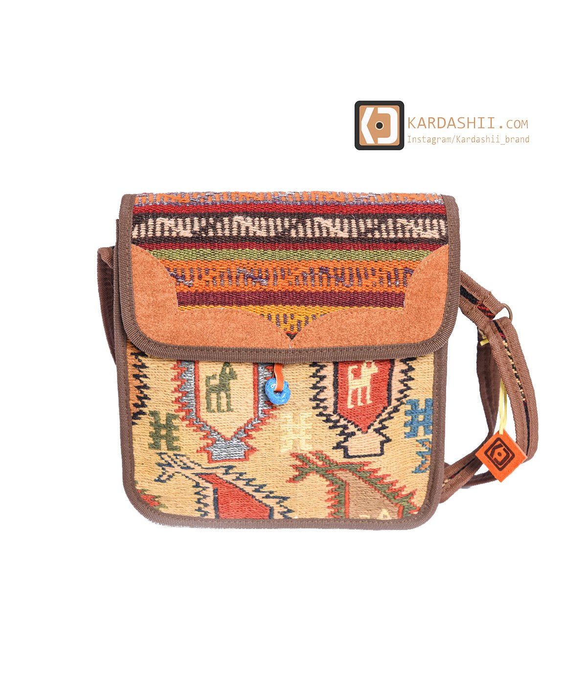 This beautiful handmade kilim flap bag has been designed for modern interior concepts. The yarns are processed and twisted by hand, painted with herbal colors, and woven with a wool warp up to one cm thick. It is completed by an interior lined with durable cotton fabric and leather. It is a beautiful representative of its guild and loves to be combined with a modern minimalistic interior design. This carpet bag is a unique piece of art, which you wouldn't want to miss anymore.
